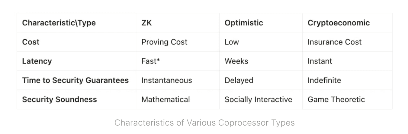 Computational Enhancements Coprocessors/Computation Networks extend the computational capabilities of blockchain networks, offering specialized processing power for complex operations. Different types of coprocessors exhibit distinct cost, latency, and security characteristics. Combining different types of coprocessors can lead to an optimized user experience. Some examples: