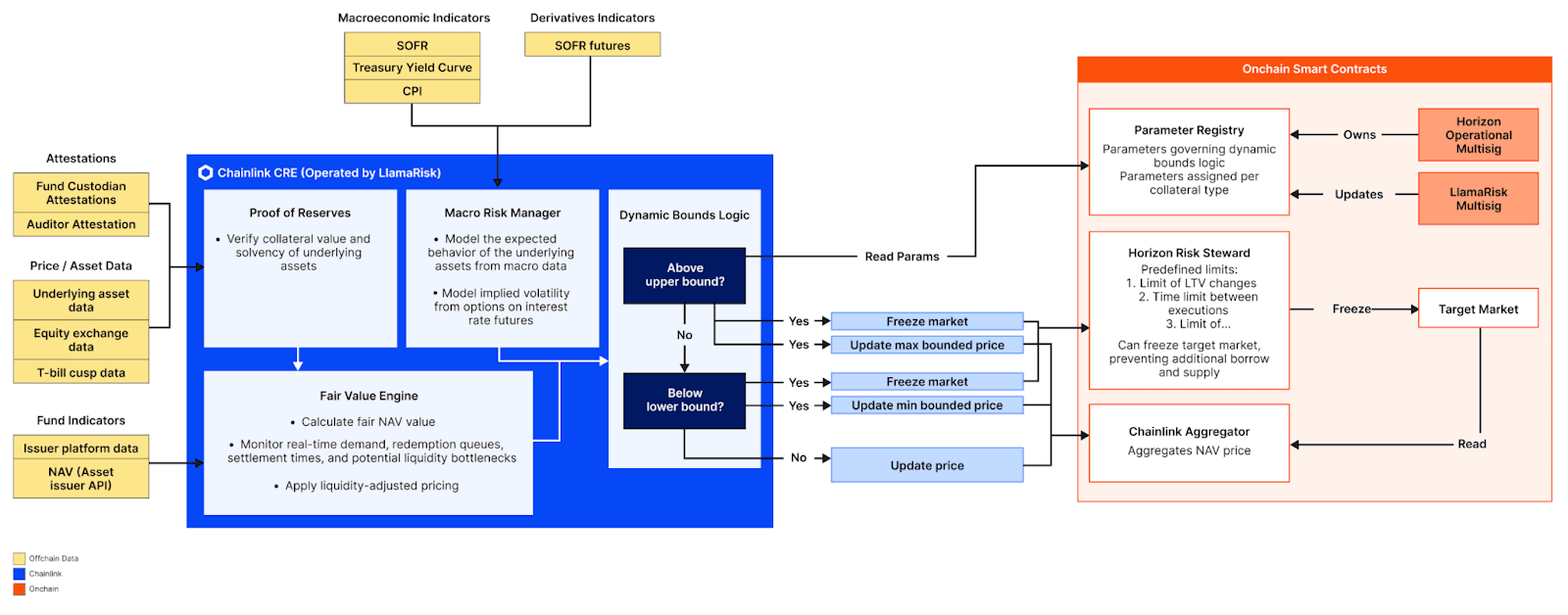 Aave Horizon is a leader in DeFi lending, bringing utility to RWAs by allowing institutions and other qualified users to borrow stablecoins against RWA collateral. It is now also establishing industry standards with the phased rollout of LlamaGuard NAV security enhancements. The upcoming release will introduce dynamic price bounds to Chainlink NAVLink feeds configured via an onchain registry. The subsequent implementation will leverage the Chainlink Runtime Environment for enhanced modularity and extensibility, enabling LlamaRisk to incorporate additional market signals and automate protocol parameter management.