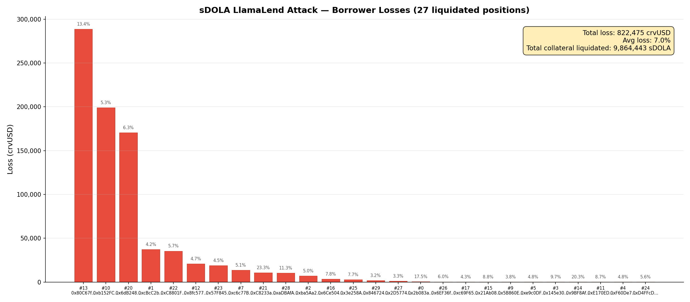 Methodology: For each of the 27 liquidated positions, we snapshot the pre-attack state (block 24,566,936) by reading each borrower's collateral (sDOLA + crvUSD in bands) and debt from the Controller. We convert sDOLA collateral to crvUSD-equivalent using the pre-attack convertToAssets() rate (1.189), which represents the actual redemption value of sDOLA at that block. The borrower's loss is defined as: