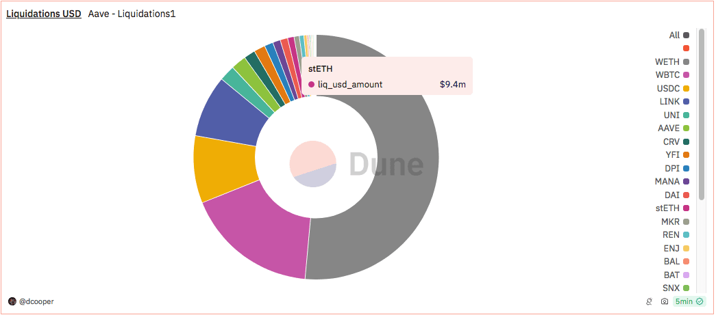 This manual oversight and risk parameter change was mostly successful in limiting the potential extent of liquidations on Aave markets, with $9.4M of stETH collateral liquidated during this three-month depeg period. It is also important to mention that the extent of stETH's depeg never reached more than 6%, which was also a stress-limiting factor. Since the overall market tone was negative, other collateral assets suffered more in liquidation.