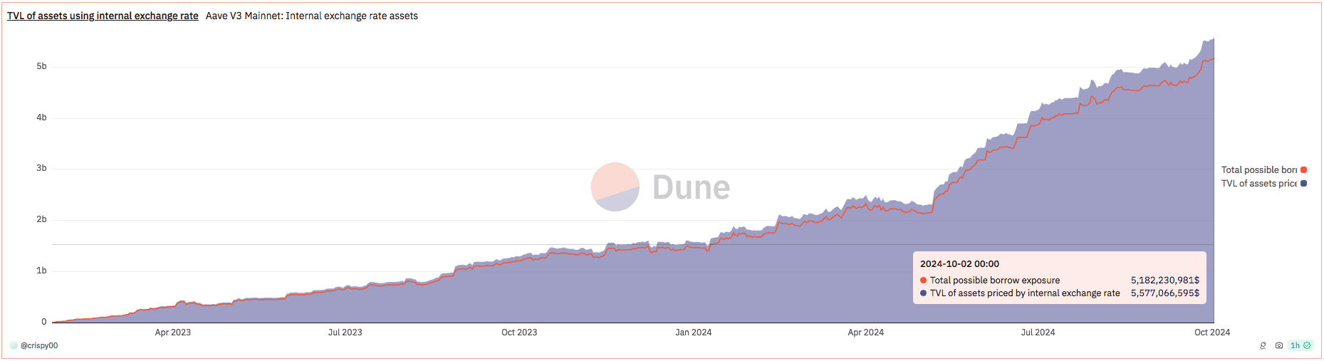 Moreover, focusing on the protocol's borrow-side exposure, internal exchange rate-priced assets have a maximal borrowable exposure ( calculated as e-mode max LTV * max supply) of over $5B. This maximal exposure assumes that all borrow positions are an e-mode enabled asset where applicable (e.g. borrow ETH against wstETH). This applies to LST tokens which currently have an e-mode loan-to-value of 93%. In other words, it indicates the total potential value that would become vulnerable in case of consensus penalty lags or exploitation of the internal exchange rates.