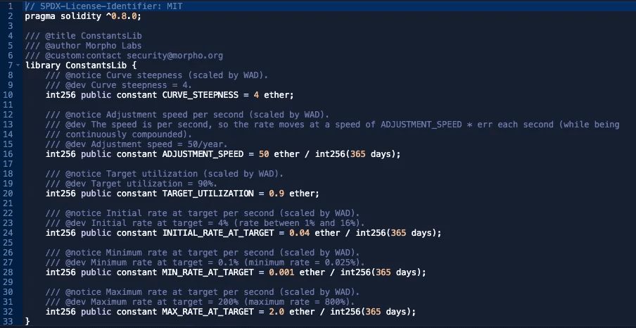 The ConstantsLib.sol stores constants relevant to the IRM calculation. Note the ADJUSTMENT_SPEED * ERROR, continuously compounded each second, defines the speed of adjustment to the curve (in seconds). Overall this gives the formula speed(t)=exp(ADJUSTMENT_SPEED * err * elapsed).