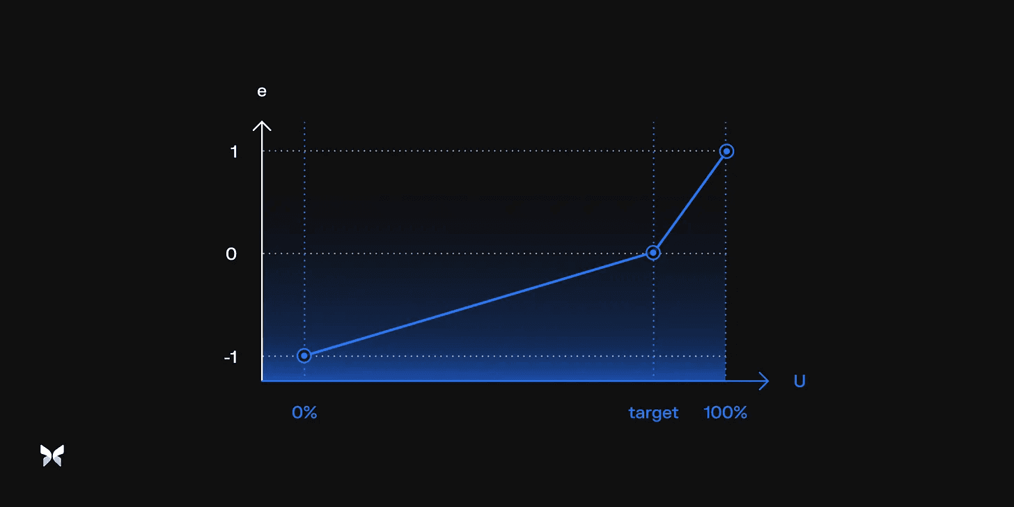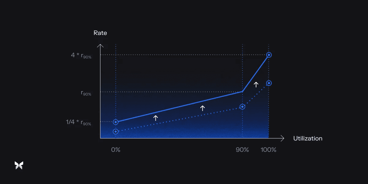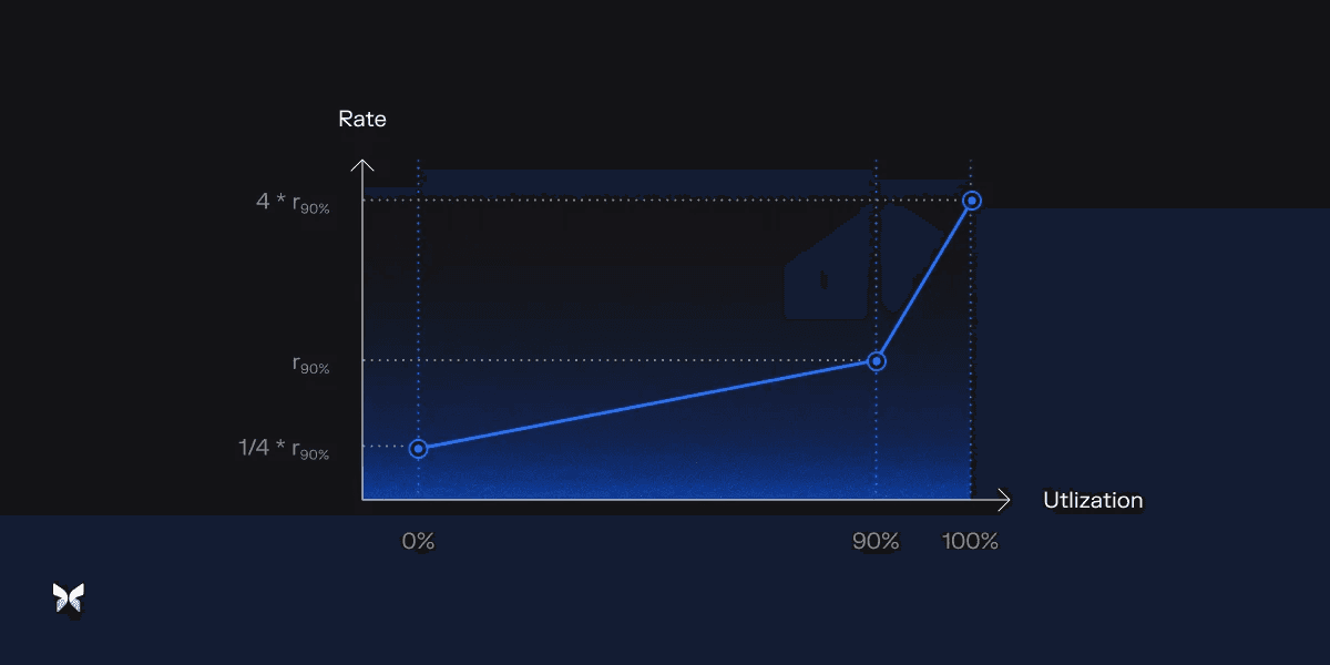 At the 90% target, there is a kink that rapidly increases the borrowing rate from the target rate to 4x the target rate at 100% utilization. This incentivizes borrowers to repay their loans and/or lenders to allocate to the market.