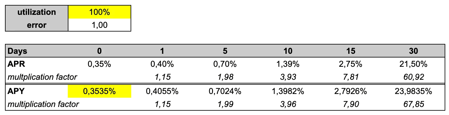 The cells highlighted red indicate that the maximum rate of 800% (as defined in the constant MAX_RATE_AT_TARGET == 200%) has been reached. This shows that if borrowing were to immediately shift from 0 to 100, it would take at least ~30 days before rates increase enough that borrowers may be required to close their positions. This demonstrates the highly accommodative IRM that gives borrowers ample time to respond to changing market dynamics.