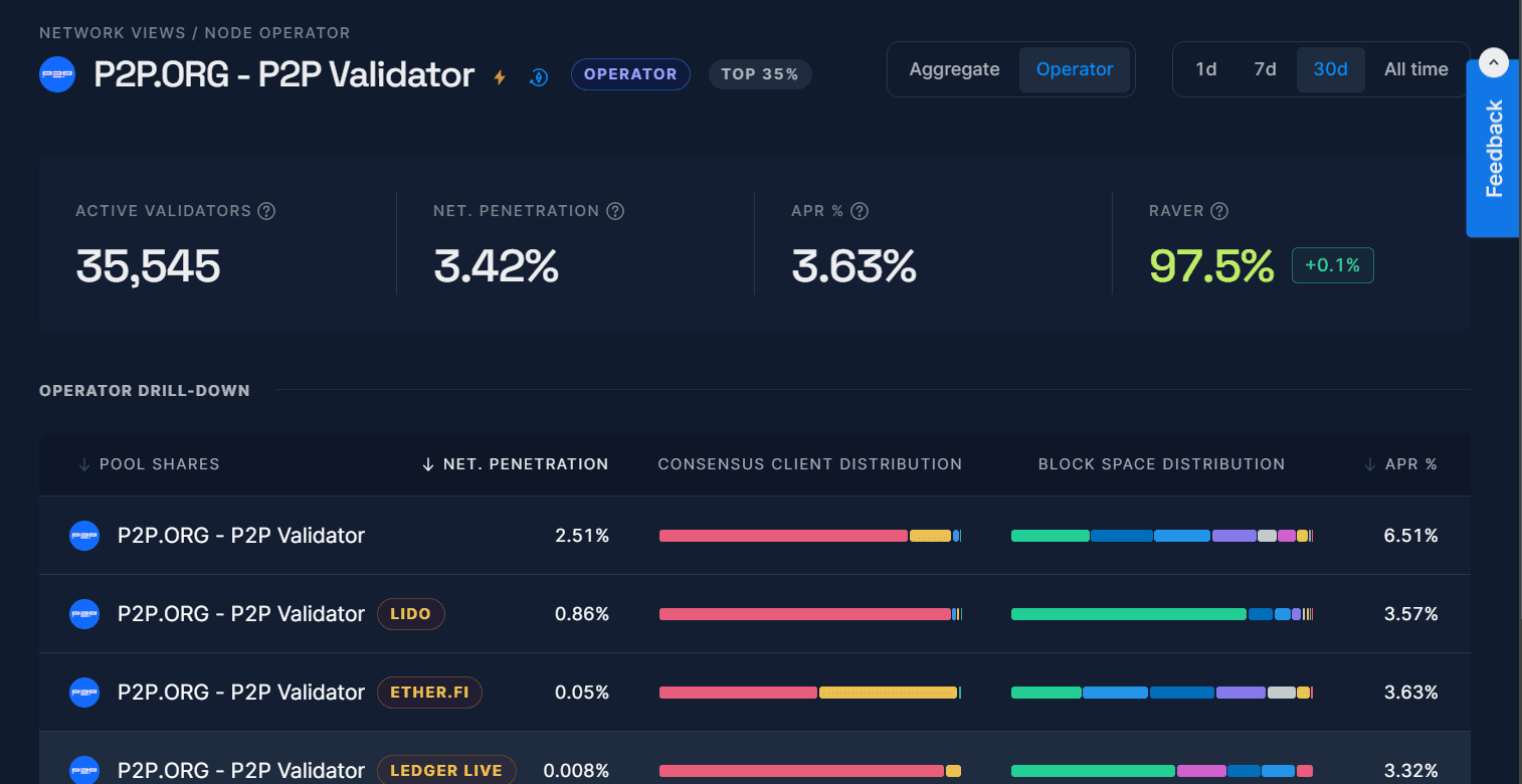 Over a trailing 30-day period, P2P.org has performed in the top 35% as calculated by Rated.Network's "Rated Effectiveness Rating" (RAVER), a composite scoring metric of operator performance in their deterministic responsibilities.
