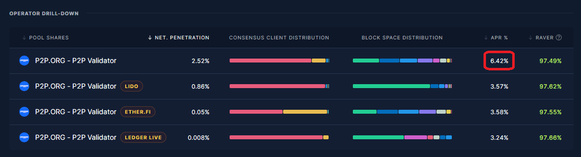P2P.org Staking pool: P2P.org operator is distinguished by having the highest APR compared to Lido/Etherfi/Ledger operators