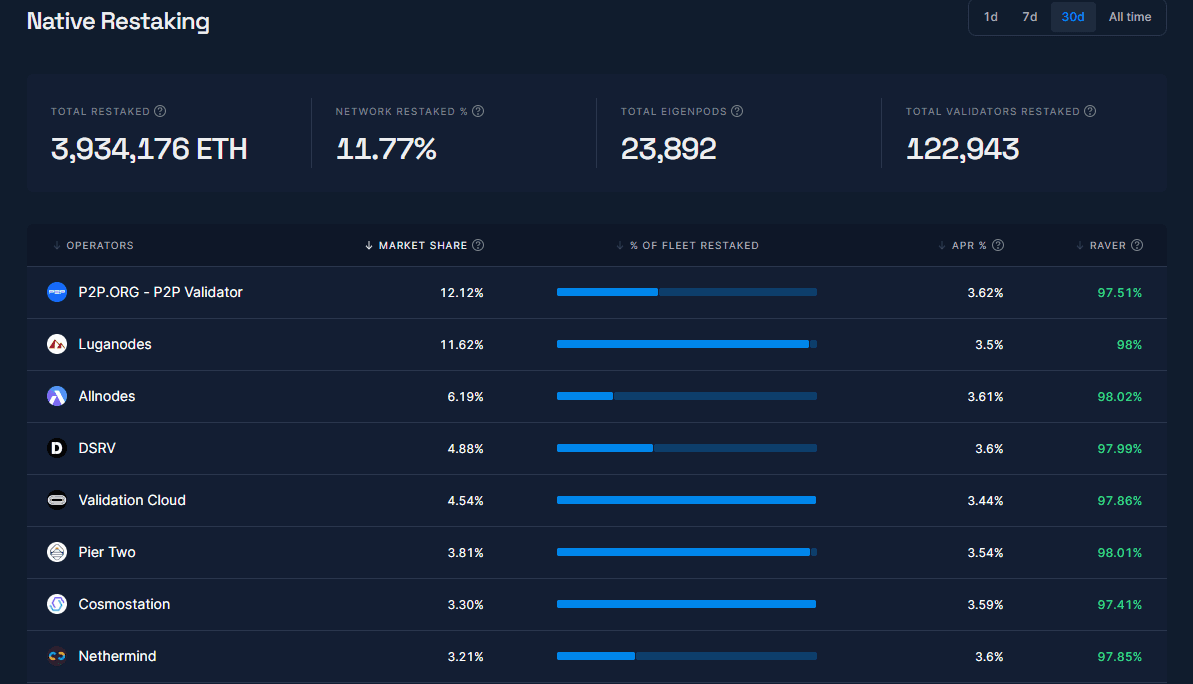 P2P.org has largest Native Restaking ETH market share (12.12%)