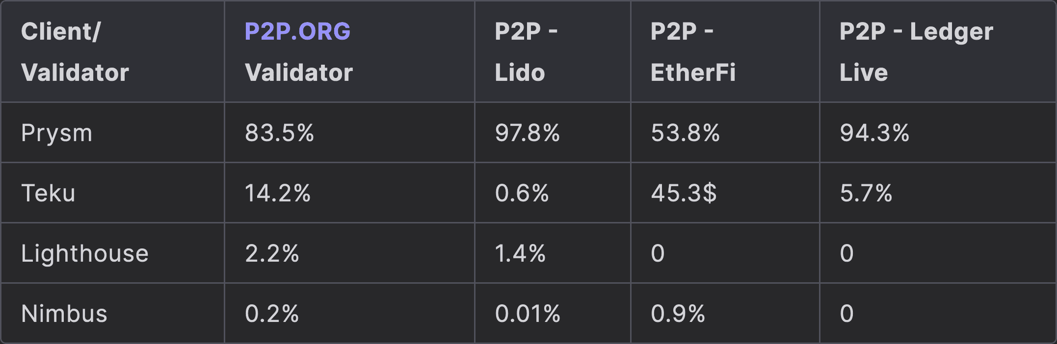P2P.org emerges as a well-established and reputable player in the staking industry, with a track record dating back to 2013. The company offers a comprehensive suite of staking services, catering primarily to institutional clients, which suggests a focus on high-value, sophisticated customers. P2P.org's recent completion of the SOC 2 Type I audit demonstrates a commitment to maintaining robust security protocols and data protection measures. However, the lack of publicly available details regarding their internal security controls and validator infrastructure raises some concerns about transparency. The company's reliance on a potentially centralized cloud provider for their infrastructure could introduce geographical concentration risks. While P2P.org claims to offer comprehensive slashing protection, the absence of verifiable documentation to support this claim warrants caution. The company's client diversification data shows a heavy reliance on the Prysm client, which could potentially increase systemic risks.