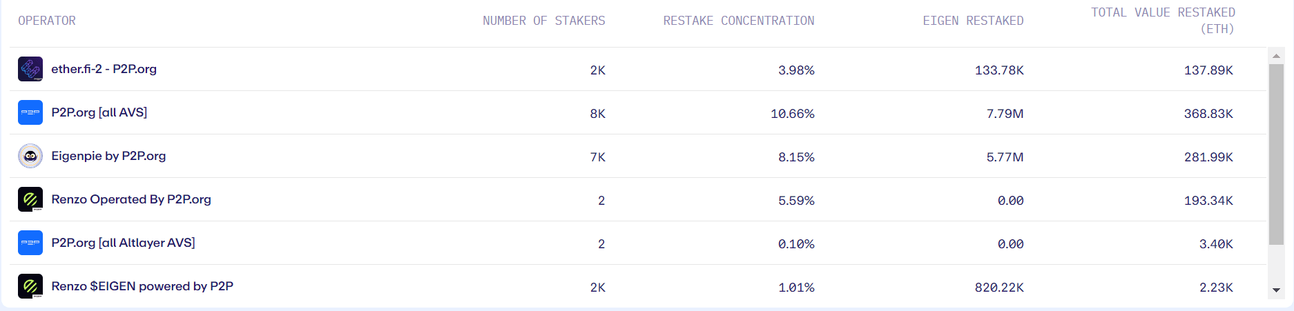 P2P operators and entities utilizing P2P staking service infrastructure are outlined in the table below. P2P.org has two dedicated operators responsible for securing all AVSs and all Altlayer-specific AVSs.