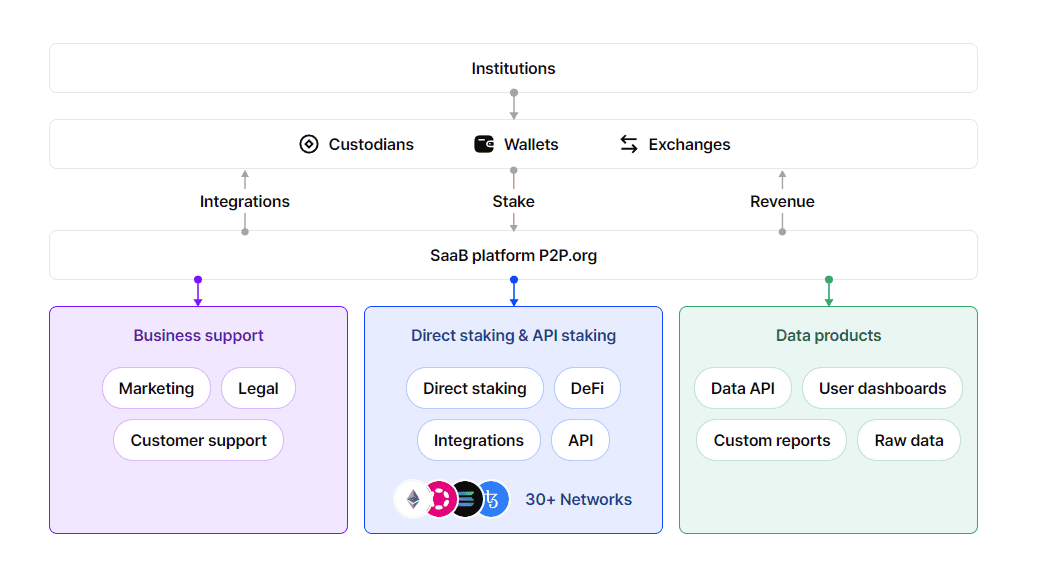 P2P caters primarily to institutional clients such as exchanges, custodians, investment funds, wallets, private investors, RaaS platforms, and L1/L2 networks. Under the established business-to-business (B2B) model different projects are allowed to integrate P2P staking pools on their front-end. While not excluding retail investors, P2P's focus on institutional clients is evident in its minimum staking requirement of 32 ETH to deploy one ETH validator on the platform.