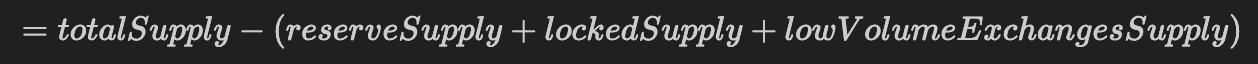 The outstanding supply is simply the total amount of stablecoins in circulation over time. Free-float supply uses a methodology developed by CoinMetrics that applies a standardized criteria for which units of supply to exclude from free float. Free-float Supply is calculated as: