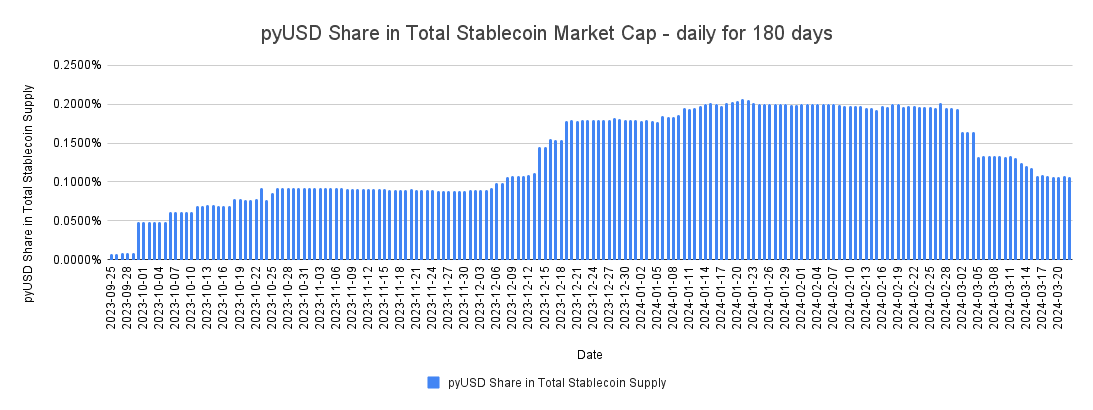 The market share of PYUSD in the total stablecoin market capitalization is approximately 0.106%, and PYUSD is ranked as the 8th largest stablecoin on the Ethereum blockchain in terms of market capitalization, as of March 22.