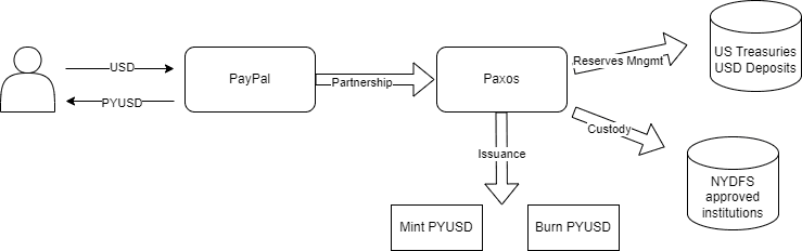 In the off-chain dimension, Paxos performs activities of the highest degree of importance concerning issuance, custody, transfers, reserves management, etc. PayPal integrates PYUSD into its platform, providing users the ability to buy, hold and transact with stablecoins.