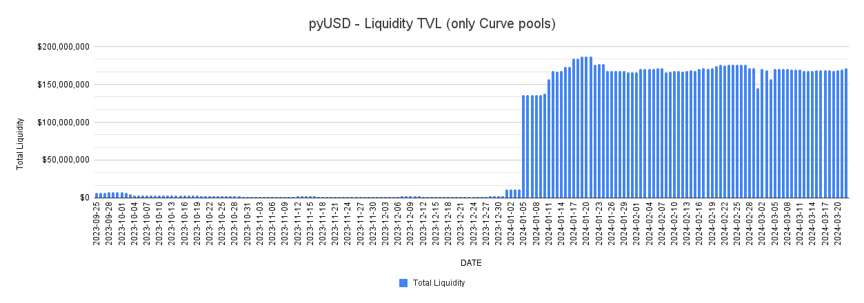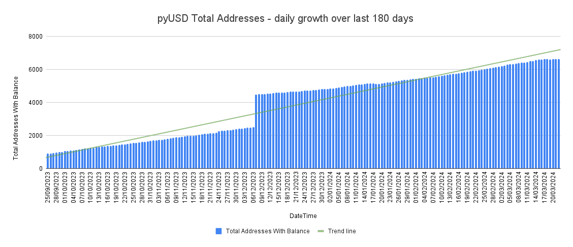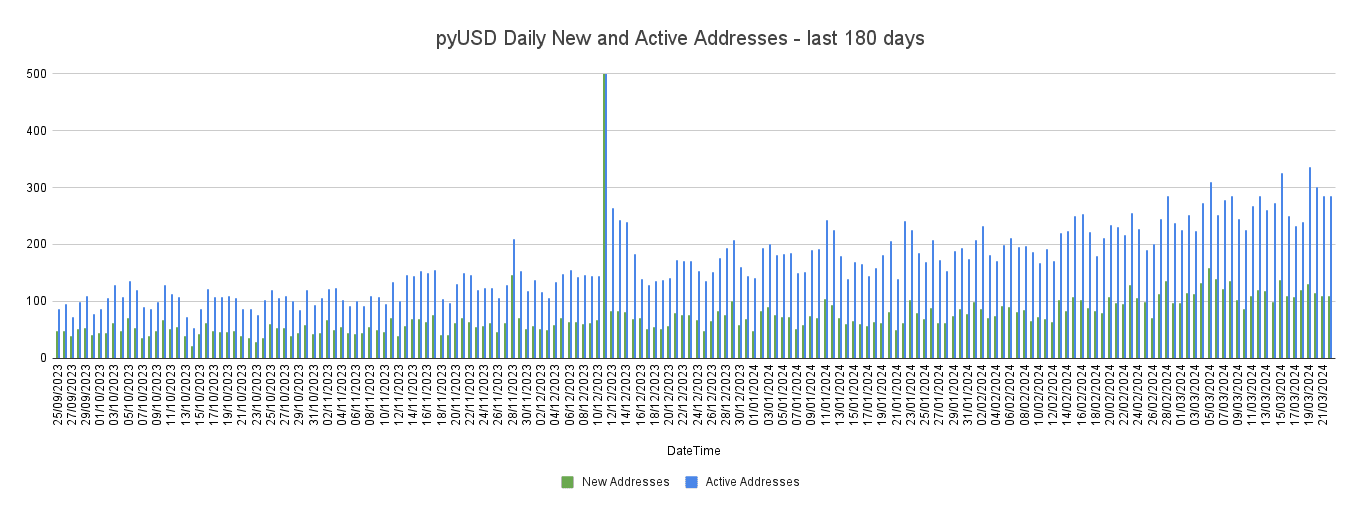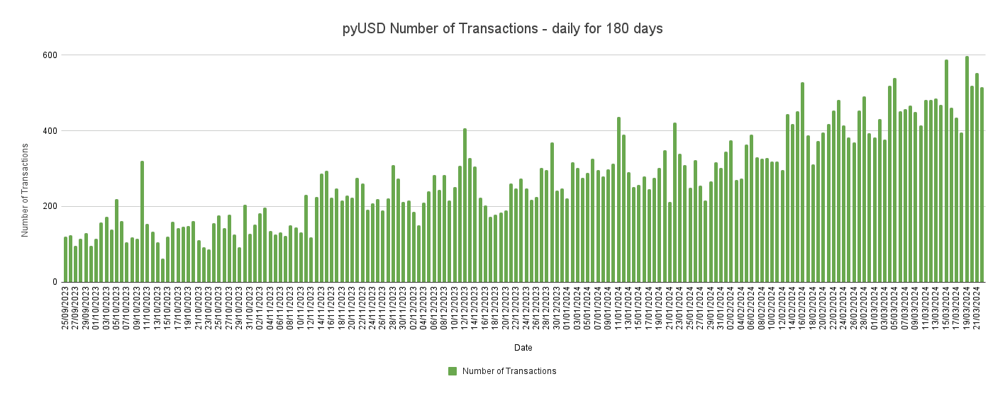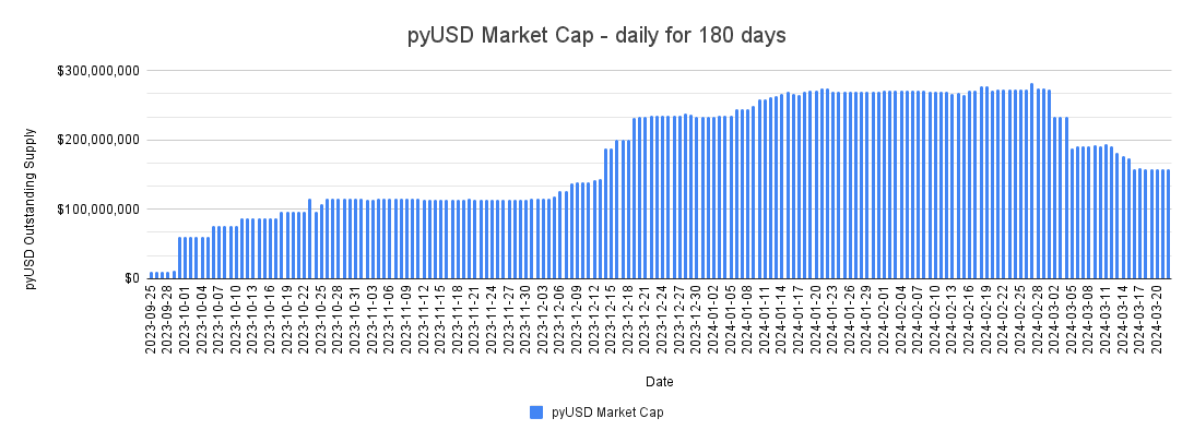 Below is the pyUSD outstanding supply over a 180 day period since late-September until 3/22/2024.