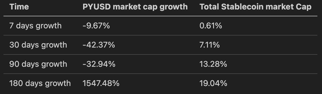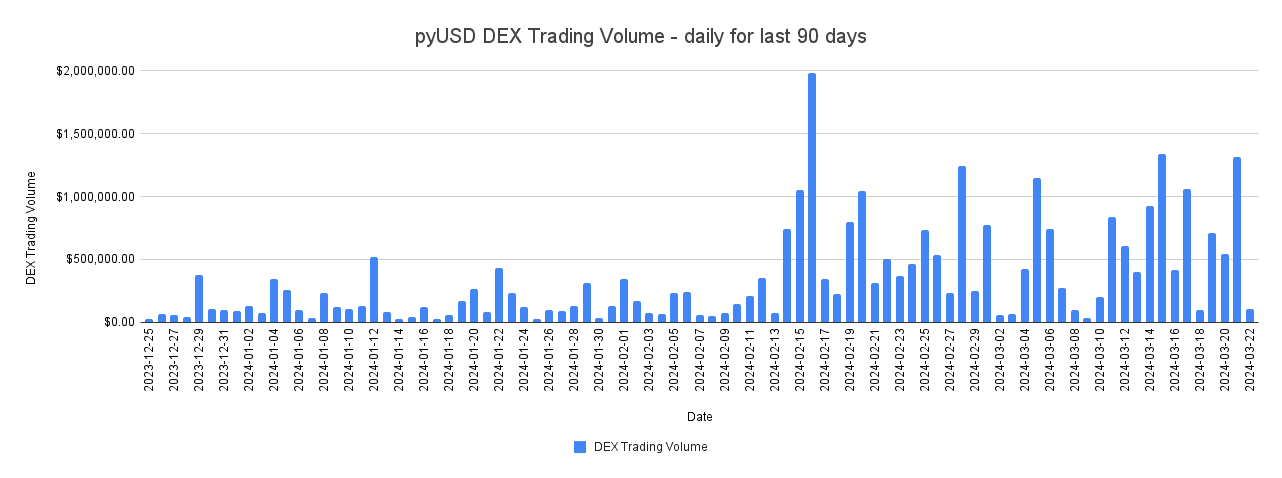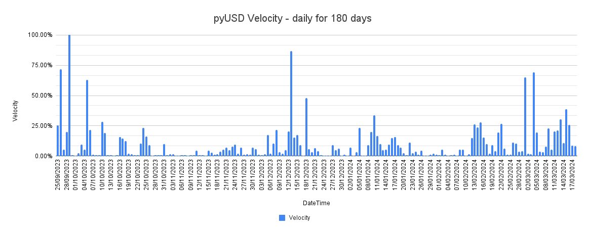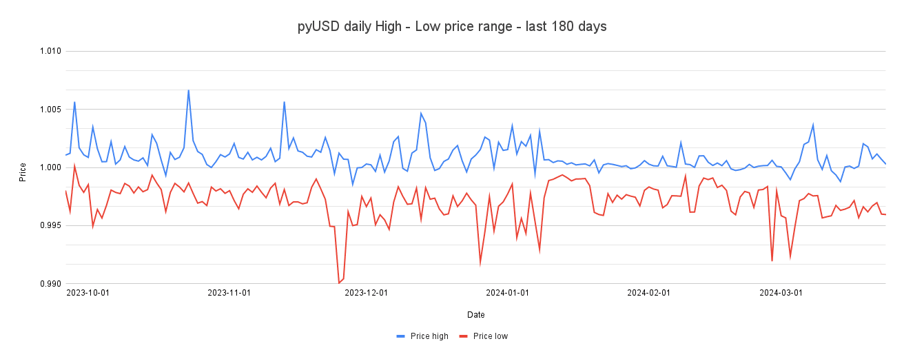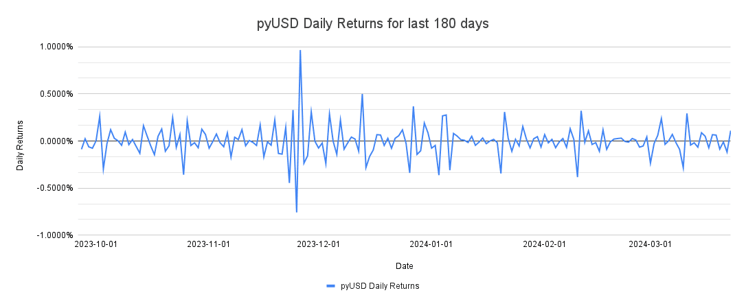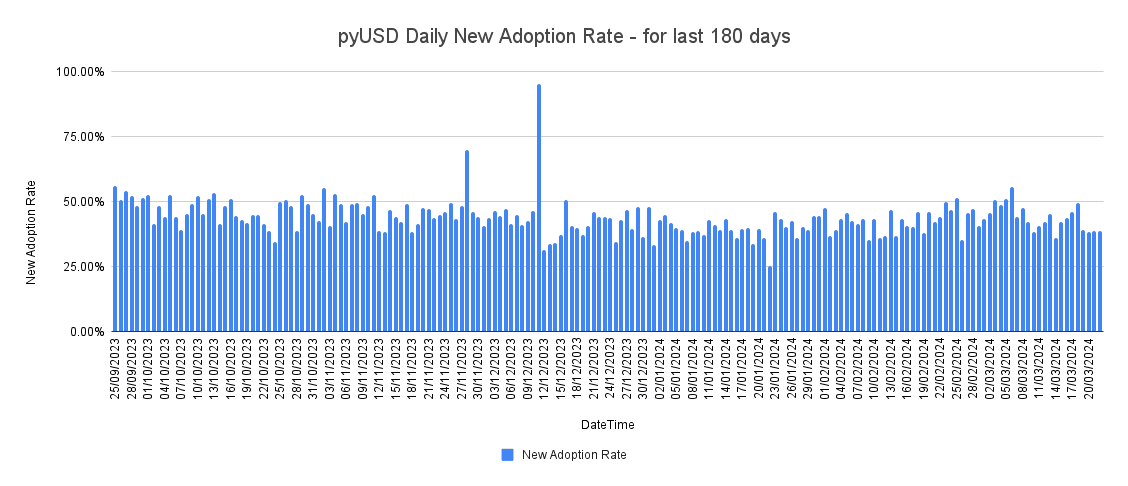 Below is the pyUSD outstanding supply over a 180 day period since late-September until 3/22/2024.