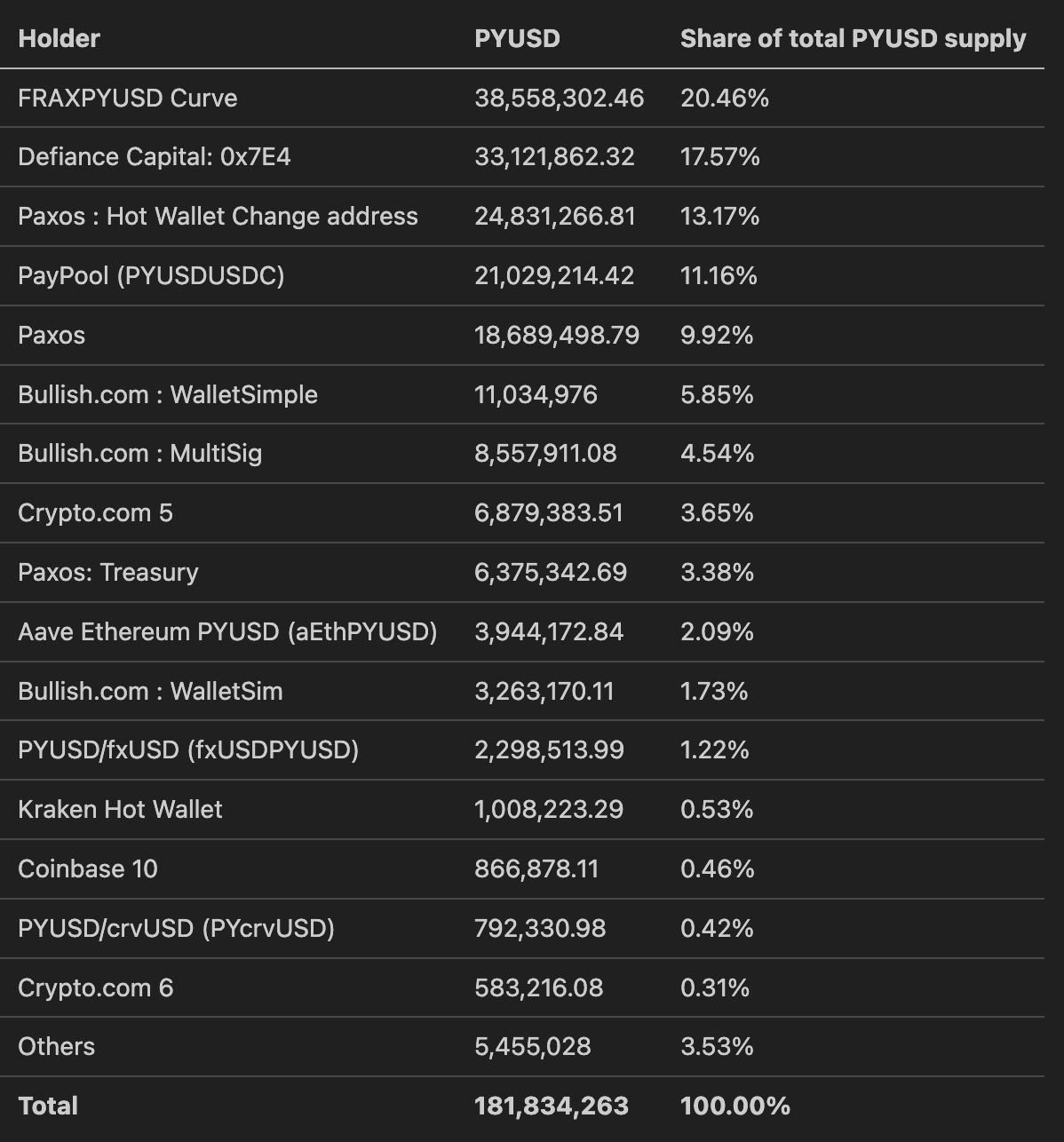 PYUSD holderAmountShare of Total SupplyDefiance Capital33,121,86217.57%Paxos : Hot Wallet24,831,266.8113.17%Paxos18,689,498.799.92%Paxos: Treasury6,375,342.693.38%