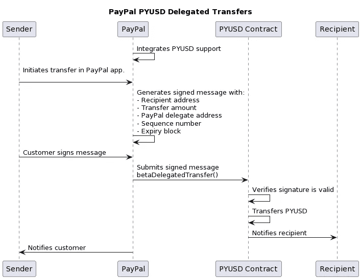 Any whitelisted address can call betaDelegatedTransfer in instances when delegated transfer mechanism should be enabled, allowing token holders to delegate the transfer of their tokens to another party by signing a permission slip. This function enables scenarios where a token holder wants to authorize a transaction without directly executing it himself, e.g pay transaction fees in PYUSD.