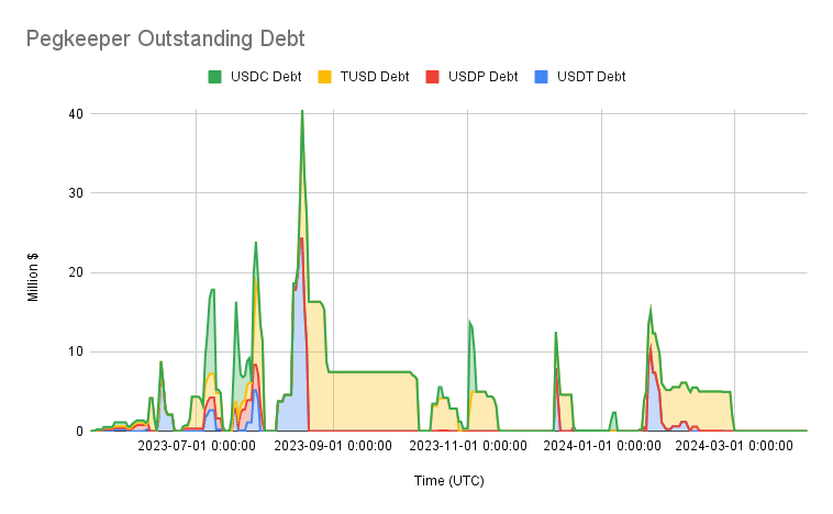 USDP has, overall, had low debt utilization. At its peak debt, it utilized 12.8% of its total debt (3.22m of 25m on July 27, 2023). There may be periods of heightened demand for crvUSD that necessitate deployment of USDP pegkeeper debt, but its marginal size has limited its usefulness for pegkeeping, which has historically demanded short, intense spurts of liquidity infusions.