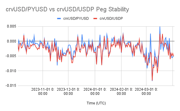 PYUSD has a much shorter history than the other pegkeepers, although it has quickly reached close to parity in liquidity depth compared to USDP and TUSD. The trend shows a relatively strong growth trend of PYUSD against USDP, further suggesting a reasonable case for transitioning some pegkeeper reliance from USDP to PYUSD.