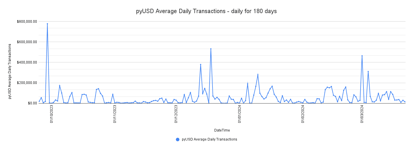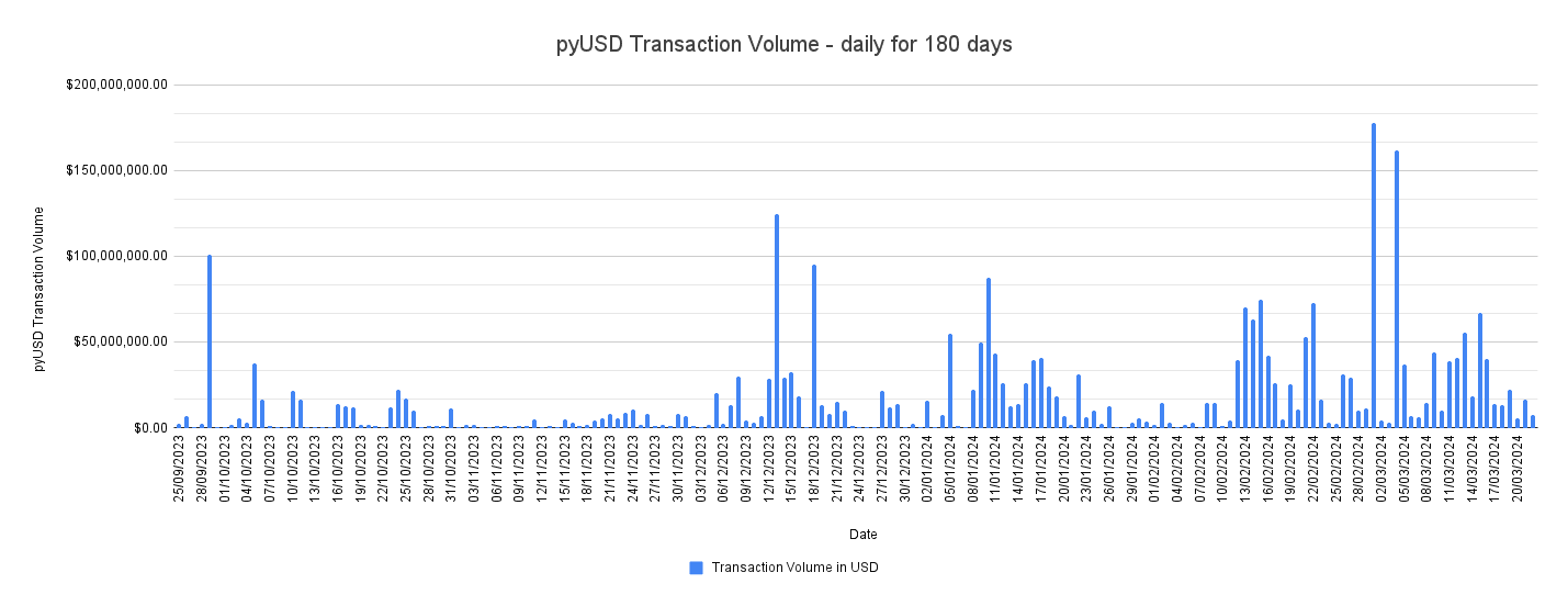 The transaction volume of PYUSD over the past 180 days has exhibited significant variability, with the daily volume ranging from a low of $93,709 to a high of $177,486,021.