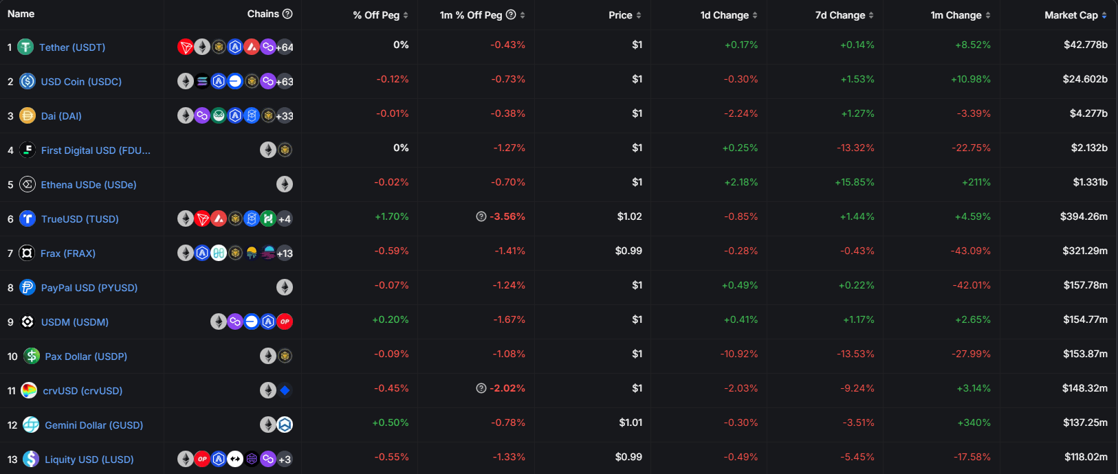 Availability on both centralized exchanges (CEXs) and decentralized exchanges (DEXs), according to Coingecko data, provides users with multiple secondary venues to engage with the stablecoin. It is most prominently paired with USD and USD stablecoins, with some pairings against ETH and BTC.