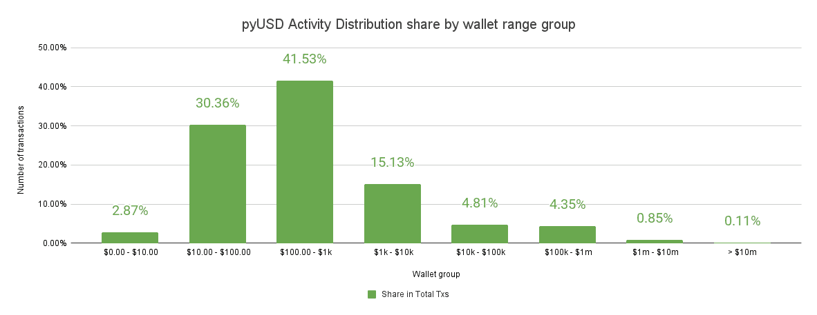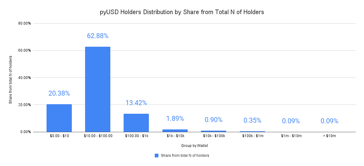 The chart above shows that 62.88% of the total number of PYUSD holders are addresses containing between $10 and $100 in PYUSD tokens. Additionally, 96.68% of PYUSD holders possess less than $1,000 worth of PYUSD in their wallets.