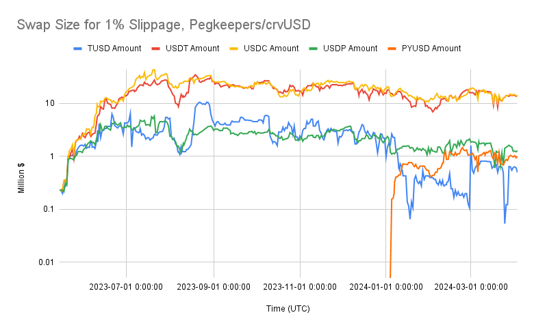 The existing pegkeeper pools (crvUSD/USDT, crvUSD/USDC, crvUSD/USDP, and crvUSD TUSD) and the candidate pegkeeper pool are compared by the swap size needed to produce 1% of slippage over time. The chart is in log scale due to the scale of the USDT/USDC crvUSD pools compared to the rest.