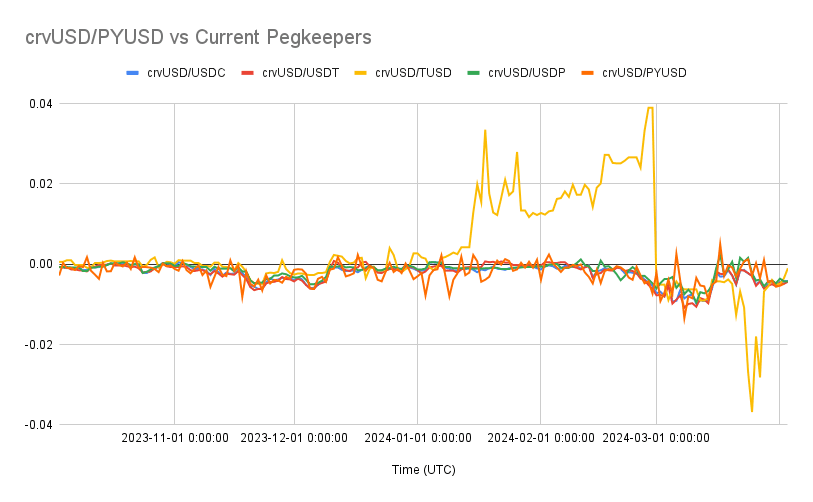 TUSD is a notable outlier for the other pegkeepers, including the PYUSD candidate, over the observed time period from 10/5/2023 - 4/2/2024.