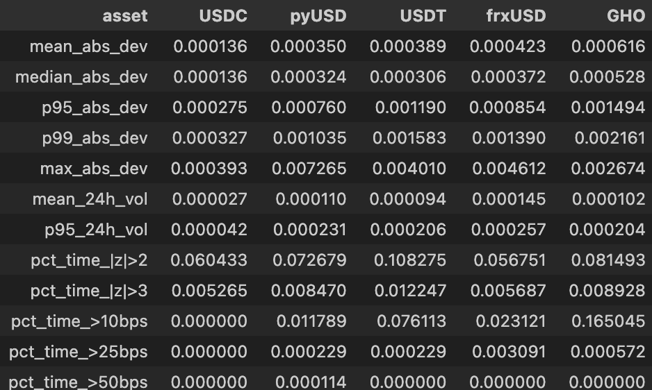 Absolute peg accuracy: USDC exhibits the tightest peg (1.36 bps mean absolute deviation), followed by PYUSD (3.50 bps) and USDT (3.89 bps), and frxUSD (4.23 bps). GHO is the loosest at 6.16 bps, approximately 4.5× wider than USDC. This indicates a structurally wider equilibrium band rather than episodic dislocations.