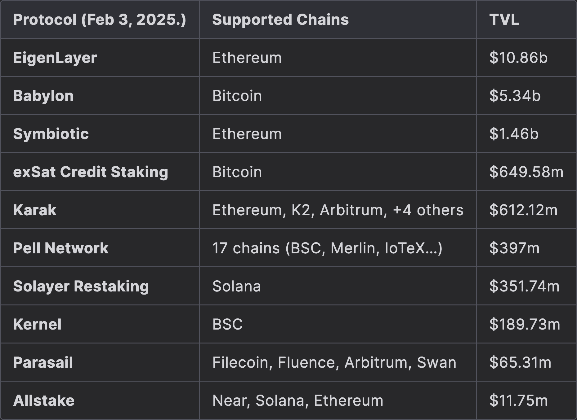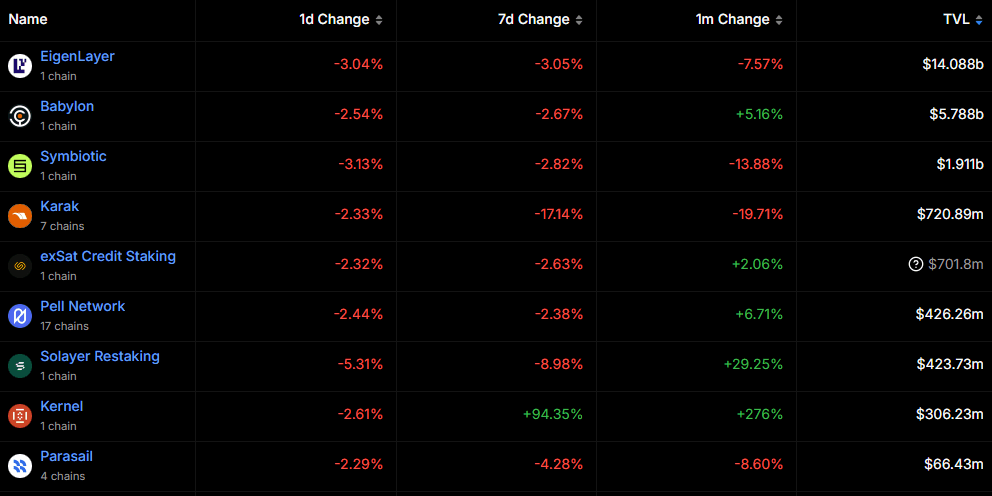 As of January 30, 2025, EigenLayer remains a key restaking protocol on Ethereum, capturing roughly $14.08 billion in TVL (~57.65% share). Babylon (BTC-based) and Symbiotic (flexible Ethereum-based) are notable competitors.