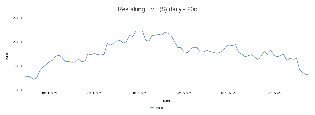 Total Restaked Value (Restaking TVL) measures capital restaked in these protocols, reflecting user confidence. Over the past 60 days, a -34.19% decline in Restaking TVL indicates capital outflows, partly due to broader crypto market volatility. Over a 90-day window, there is a +3.65% increase, showing how the system’s growth still heavily depends on price movements and portfolio rebalances.