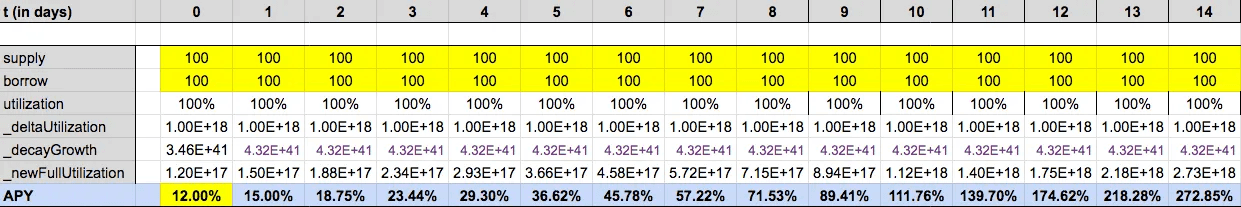 Assuming the current max rate at full utilization is 12% (given current demand in the Sturdy markets, this is a reasonable estimate), the market is persistently at full utilization, and the rate half life is 2 days (Frax’s setting), the rate increase will follow this trajectory over a 2 week period: