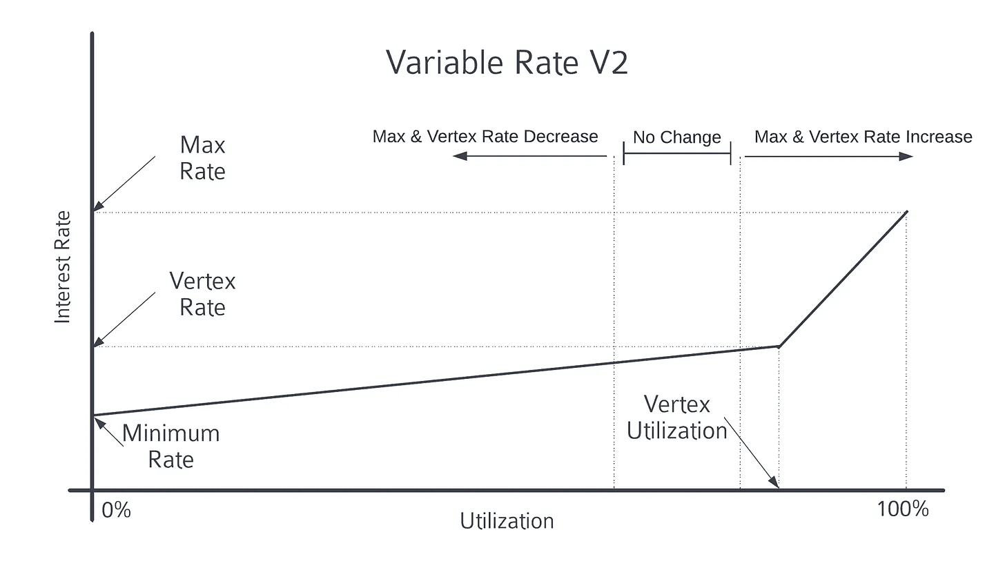 In addition to the mechanisms described above, the Variable Rate V2 mechanism introduces a time-based component to shift the curve based on utilization rates. It specifies a min and max target utilization, within which the time-based mechanism is inactive. Whenever the market utilization is greater than the max target or lower than the min target, the time-based mechanism shifts the curve.