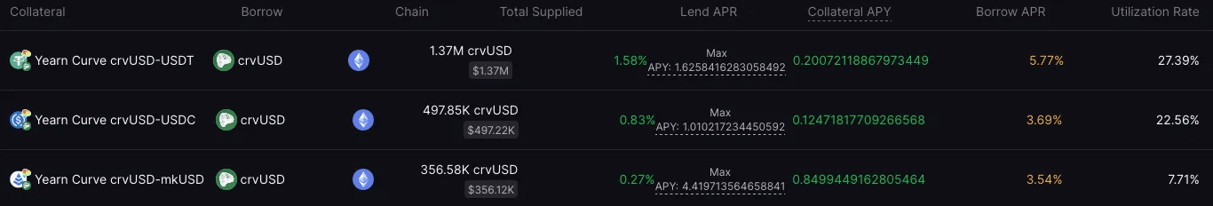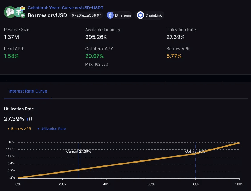 Take, as an example, the crvUSD-USDT market. It has a minimum borrow rate of 2% when there in no borrow demand. Its target rate is 13% at the vertex (80% utilization) and its max rate is 18% at full utilization. By comparison, the current utilization is 27.39%, which translates to 5.77% borrow APR.