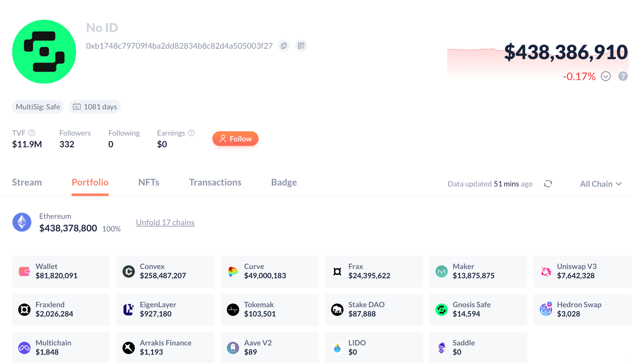 FRAX is owned by Frax Comptroller, a 3/5 multisig. According to DeBank, the address controls $438m worth of Frax protocol funds, including idle funds and LP positions. Although Frax promotes the concept of AMOs to manage protocol funds algorithmically, the multisig signers have unilateral control over the flow of these funds. In addition to managing these funds, its ownership of FRAX allows it to set and configure AMO addresses, giving it essentially supreme authority over the operation of the entire protocol.