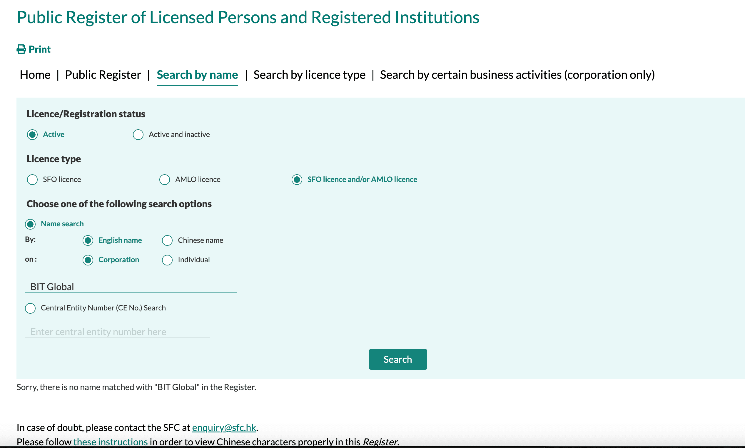 Upon conducting an inquiry with the HKMA’s Registry of Authorized Institutions, we found no registration details for BIT Global, indicating that the company does not appear to operate as an AI in Hong Kong. We extended our inquiry to the SFC’s Register of Licensees to explore the possibility of BIT Global managing a virtual asset trading platform. However, no relevant records were found there either.