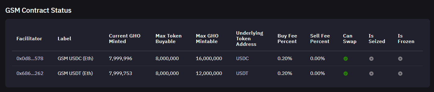 Parameter Value Exposure Cap 8,000,000 USDC Buy Fee (GHO → USDC) 0.2% Sell Fee (USDC → GHO) 0% Price Strategy Fixed 1:1 Ratio Underlying Price Range for Swap Freeze [0.99 - 1.01] Underlying Price Range for Swap Unfreeze [0.995 - 1.005] Bucket Capacity 16,000,000 GHO