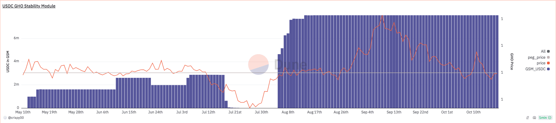 USDC GSM has been performing as expected for a price stability mechanism. In July, when the GHO price dropped 0.2% (the buy fee) below the peg, it became profitable for arbitrageurs (or swap aggregators) to redeem GHO for USDC, lowering GHO supply and consequently reducing secondary market sell pressure. The correlation between GHO price and GSM fill rate can be observed clearly:
