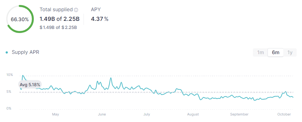 The average 6-month supply APR for USDC on Aave Mainnet markets is 5.18% with the APR trending slightly below average for the past 2 months.