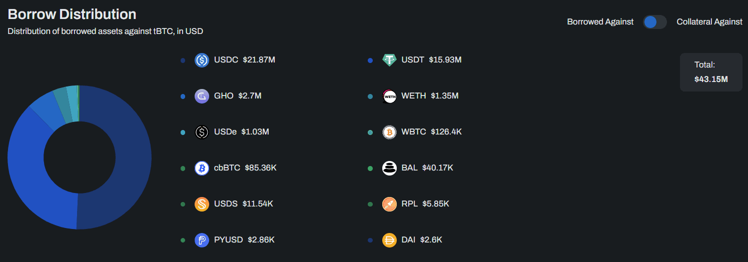 The new liquid e-Mode would enable more leverage for tBTC. It is already possible to leverage tBTC assets but subject to a lower total leverage due to a lower LTV threshold of 73%. The maximum possible leverage for tBTC on Mainnet, assuming an infinite number of loops, is currently: