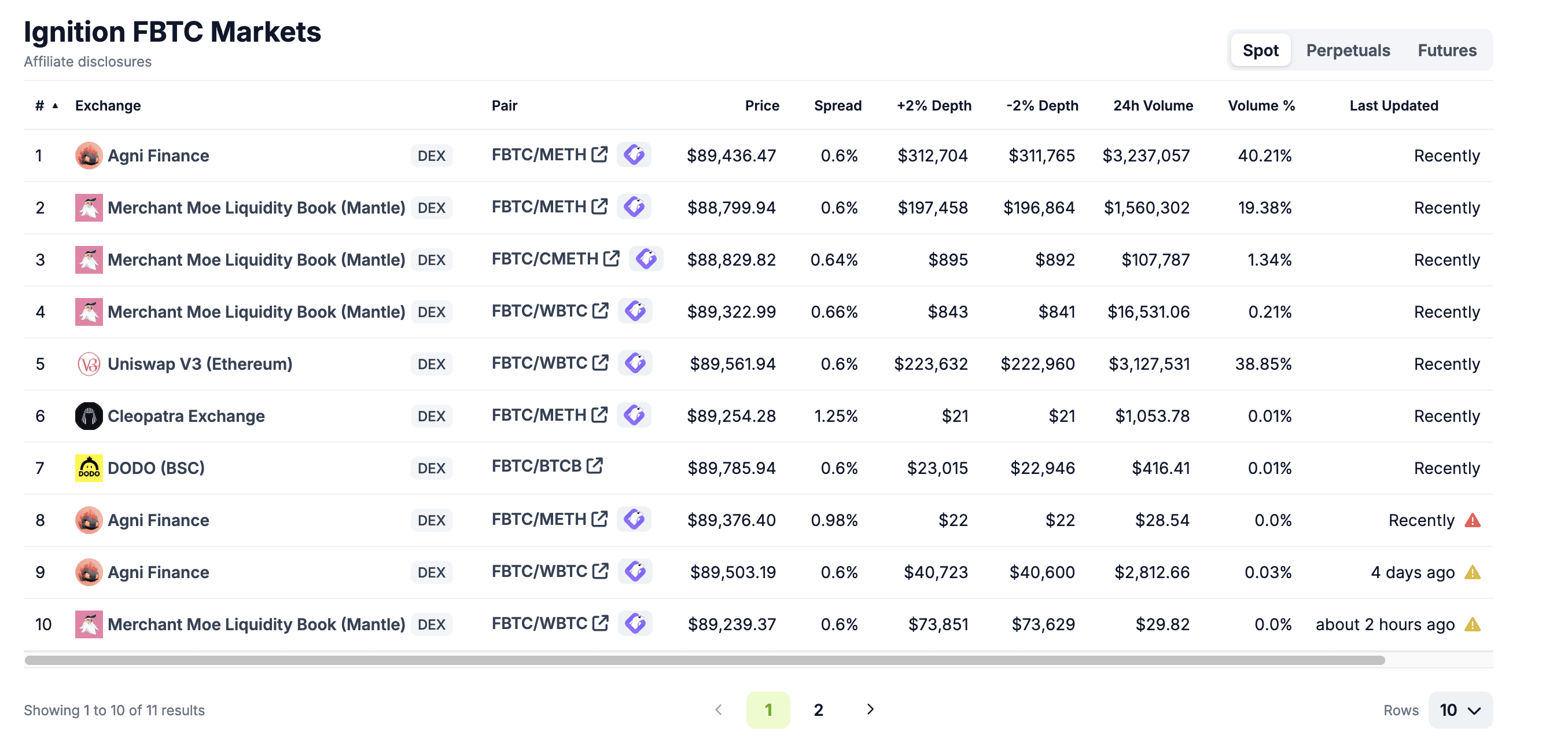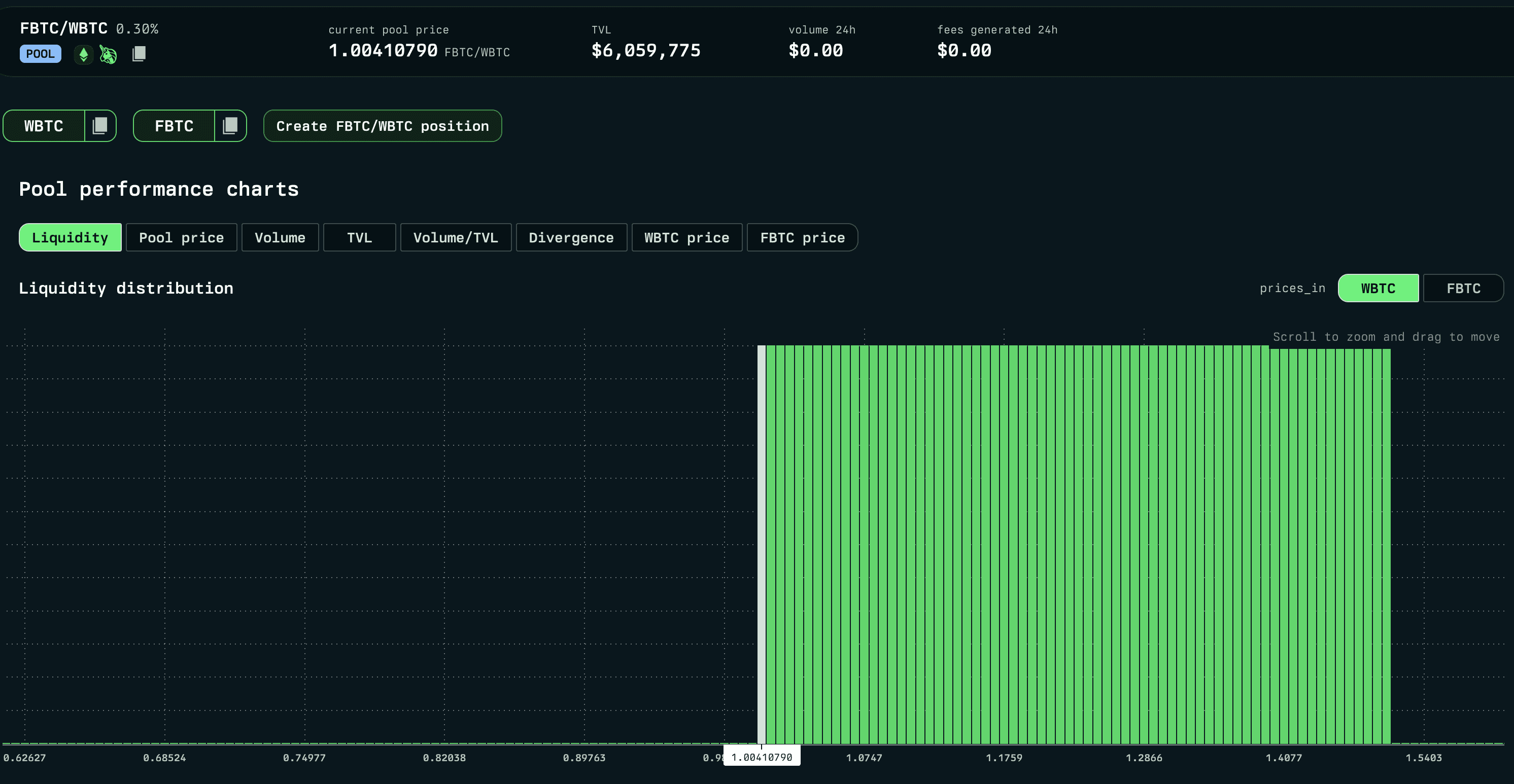 This asset is available on various decentralized exchanges, especially on Mantle. The majority of liquidity on Mainnet is paired to WBTC and held in one pool. This presents some degree of concentration risk in a black swan event. Liquidators may struggle to profitably buy collateral and swap it if the WBTC/FBTC pool goes out of range of the configured LP tick. Notably, no centralized exchanges are trading FBTC.