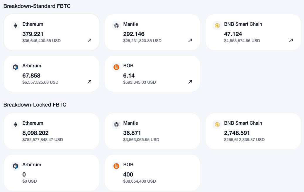 The asset complies with the ERC20 standard and has 379 FBTC on mainnet and 292 FBTC on Mantle. There is also 47 FBTC on BNB Chain. It is 1:1 backed by BTC on the Bitcoin chain held in addresses with various security measures, including Threshold Signature Schemes and Multi-Party Computation (MPC) wallets.