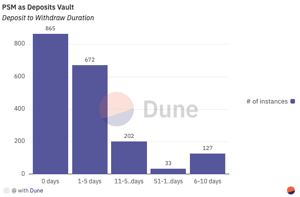 To analyze the shorter-term “piggy bank” operations where PSM is used as a deposit vault ensuring 1:1 swaps at a later time, we have inspected the wallets with smaller amounts of interactions (<500) but executing both USDC deposit and withdraw actions. The findings indicate that most deposits were short-term (<10 days). Nonetheless, there were still ~230 instances where PSM was used as a longer-term 1:1 swap guarantor.