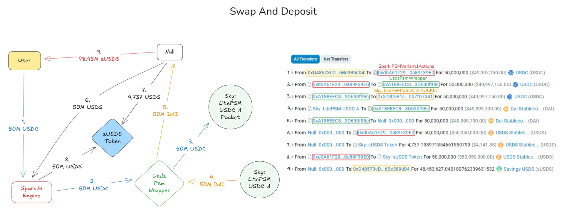 LitePSM USDC A is utilized by Sky protocol to maintain a 400M DAI buffer, with its USDC reserves held in the PSM Pocket. Currently, the PSM holds 3.27B USDC, with a theoretical ceiling of 10B. These reserves are collateral for minting USDS and sUSDS (equivalently DAI/sDAI). While PSM can be interacted with directly to perform 1:1 swaps, the illustration below details the underlying process of minting sUSDS by depositing USDC via PSM.