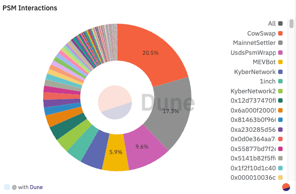 Nonetheless, similarly to the GSM, the swap aggregators, MEV Bots, and other automated entities mainly execute interactions with PSM. Around 10% of interactions are made by the USDS PSM Wrapper, which, as explained above, performs the sUSDS minting procedure. Therefore, this PSM Wrapper part can be attributed to the longer-term holdings in the PSM, which remain in the PSM according to the attractiveness of SSR yield opportunity.