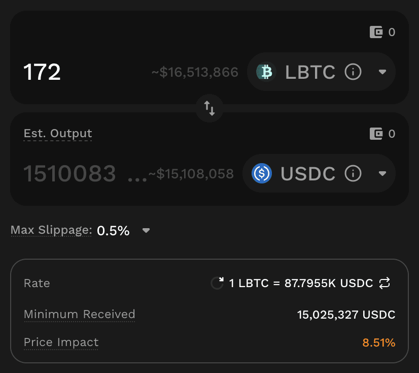 We found 172 LBTC ($16.5m) available within an 8.5% price impact on Base. Following our usual methodology, this would yield a supply cap of around 350 LBTC. Those figures are more than half of what is being proposed for the Base instance; therefore, we recommend decreasing those figures to align better with the available LBTC liquidity on Base.