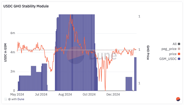 The stablecoin buffer available in the USDT/USDC GSMs on Mainnet has historically acted as a last resort peg safeguard, where at a -0.2% secondary market discount of GHO, it provided an additional GHO sell-side buffer, which helped to limit the extent of the extent of the pricing downturns. The correlation between GHO secondary market price and the GSM deposits amount is also visible in the charts below.