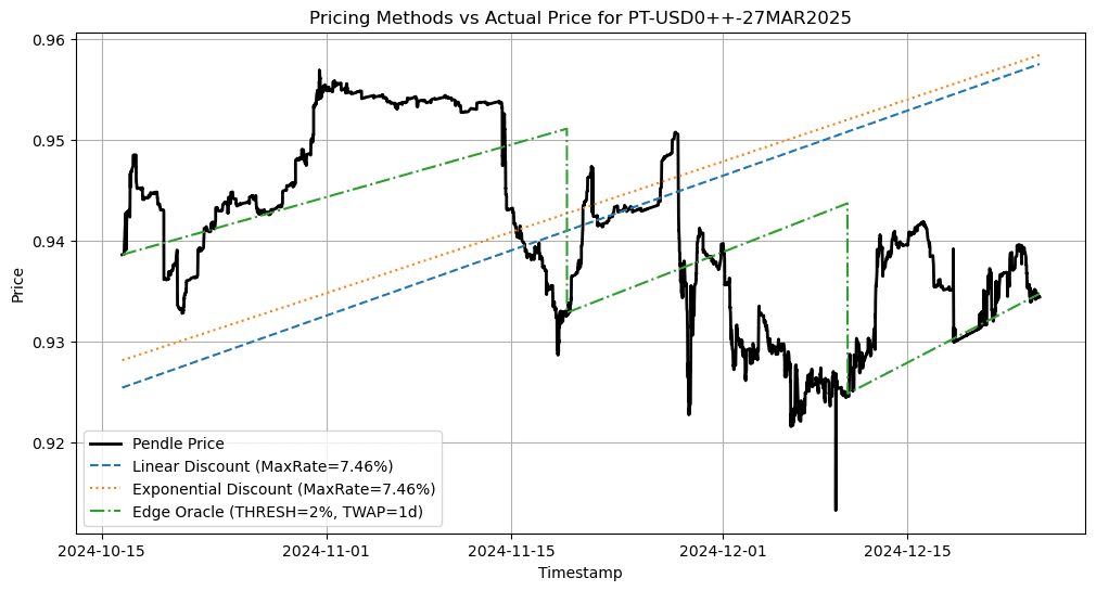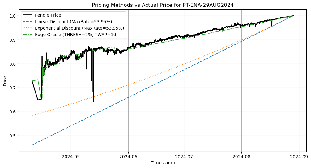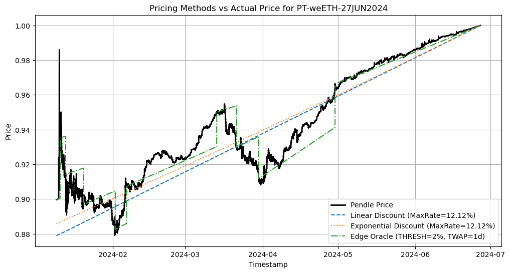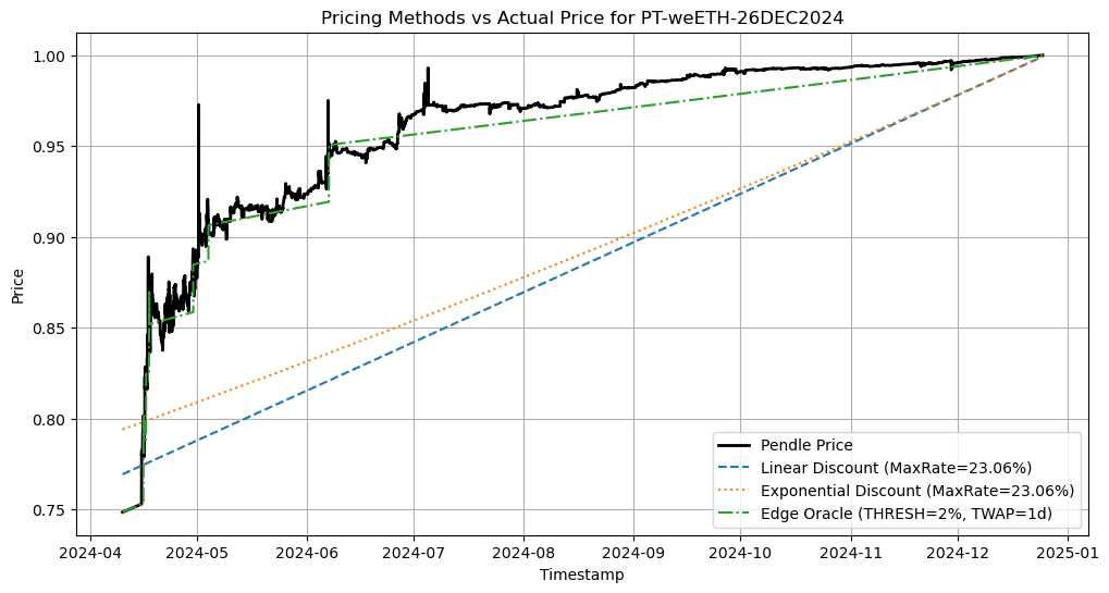 We compare the proposed pricing methods by visualizing their performance under different conditions. Our plots include three Edge Oracle curves (using different thresholds), the exponential lower and linear lower bound. To illustrate capital efficiency, we analyze two Pendle-onboarded assets with varying APY levels—PT-weETH (normal APY) and PT-ENA (high APY). This comparison highlights the similarities and differences in PT token pricing through a working example and simulations across different APY levels.