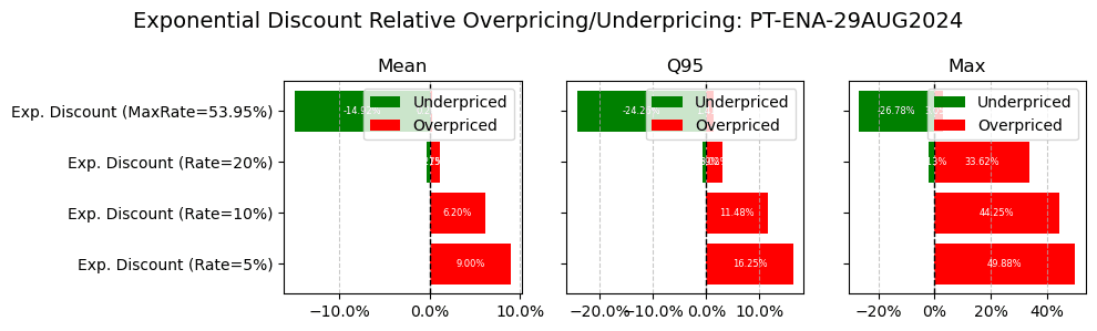 Similar findings follow for PT-ENA. Here, we observe more frequent overpricing for all pricing methods but can infer the same relationship between the parameter values and mispricing probability. Nonetheless, in this case, choosing the MaxRate still eliminates most overpricing instances, once again supporting the case of selecting the discount rate conservatively.