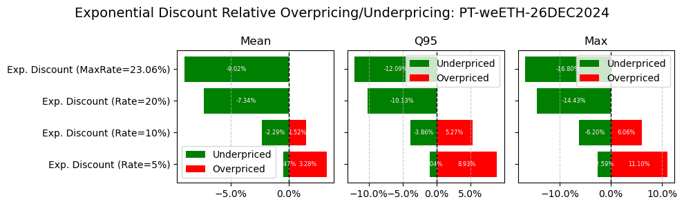 We begin with an overview of PT-weETH. The overpricing issue observed with the Edge Oracle is largely eliminated only when using very high thresholds (around 10%). This behavior is rational because such high thresholds converge the model’s dynamics to those of the exponential or linear models. In contrast, both the linear and exponential models demonstrate the elimination of overpricing when configured with either more conservative or the default MaxRate values.